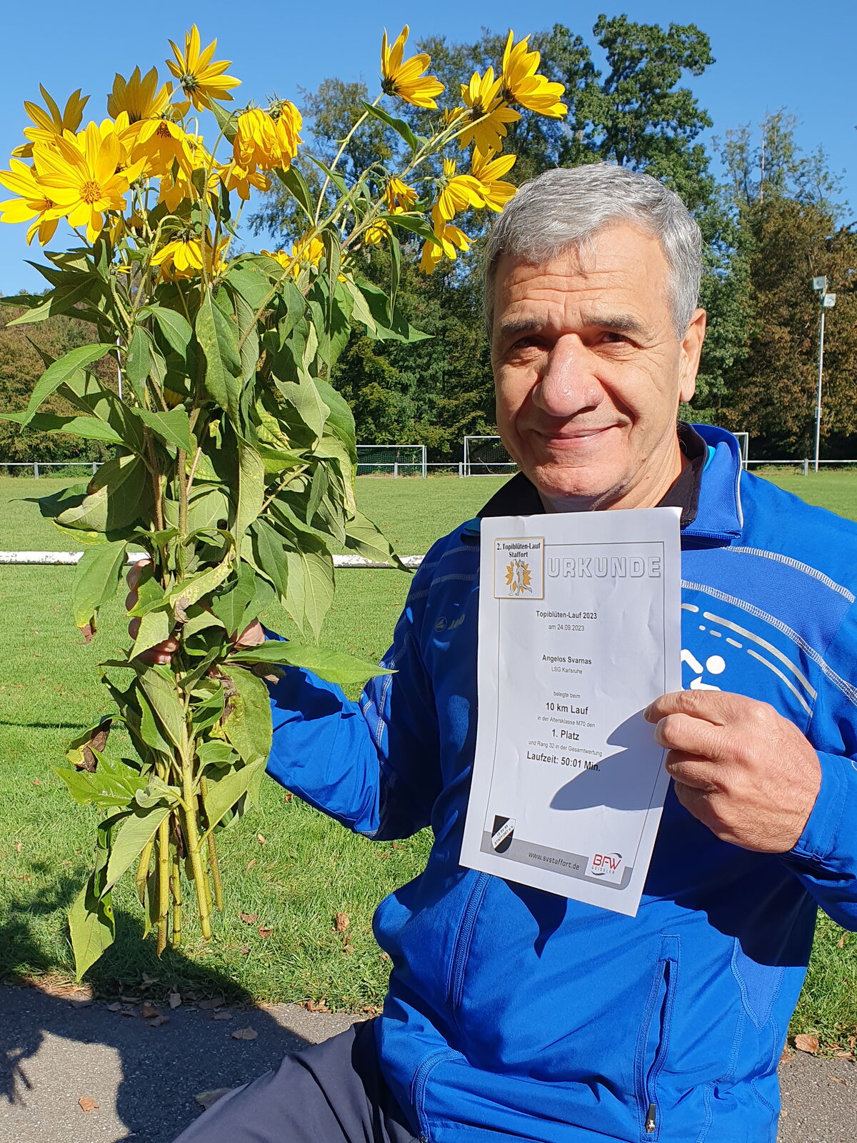 Ein sonniger Herbsttag war die perfekte Kulisse für den 2. Topiblüten Lauf in Staffort, der achtundachtzig Läuferinnen und Läufern die Möglichkeit bot, die Natur zu genießen. Der Lauf bestand aus zwei Runden, die je zur Hälfte durch einen Mischwald und durch Felder mit Sonnenblumen und Mais führten.