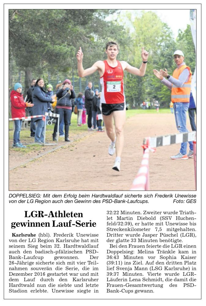 Sieben Laufwettbewerben rund um Karlsruhe-Neustadt bilden die PSD-Bank Cup Serie. Die besten vier Läufe werden addiert und daraus die Sieger ermittelt. Der letzte Lauf findet bei der LSG beim Hardtwaldlauf mit schneller Streckenführung statt. Ausgeschrieben sind zum beliebten Adidas Funktionshirt, das jeder Läufer erhält, der in die Wertung kommt, das heißt mindestens an vier Läufe teilgenommen hat, auch Tankgutscheine. Zwei der hochwertigen Gesamt- und 11-Altersklassensiegergutscheine gingen an LSGler.